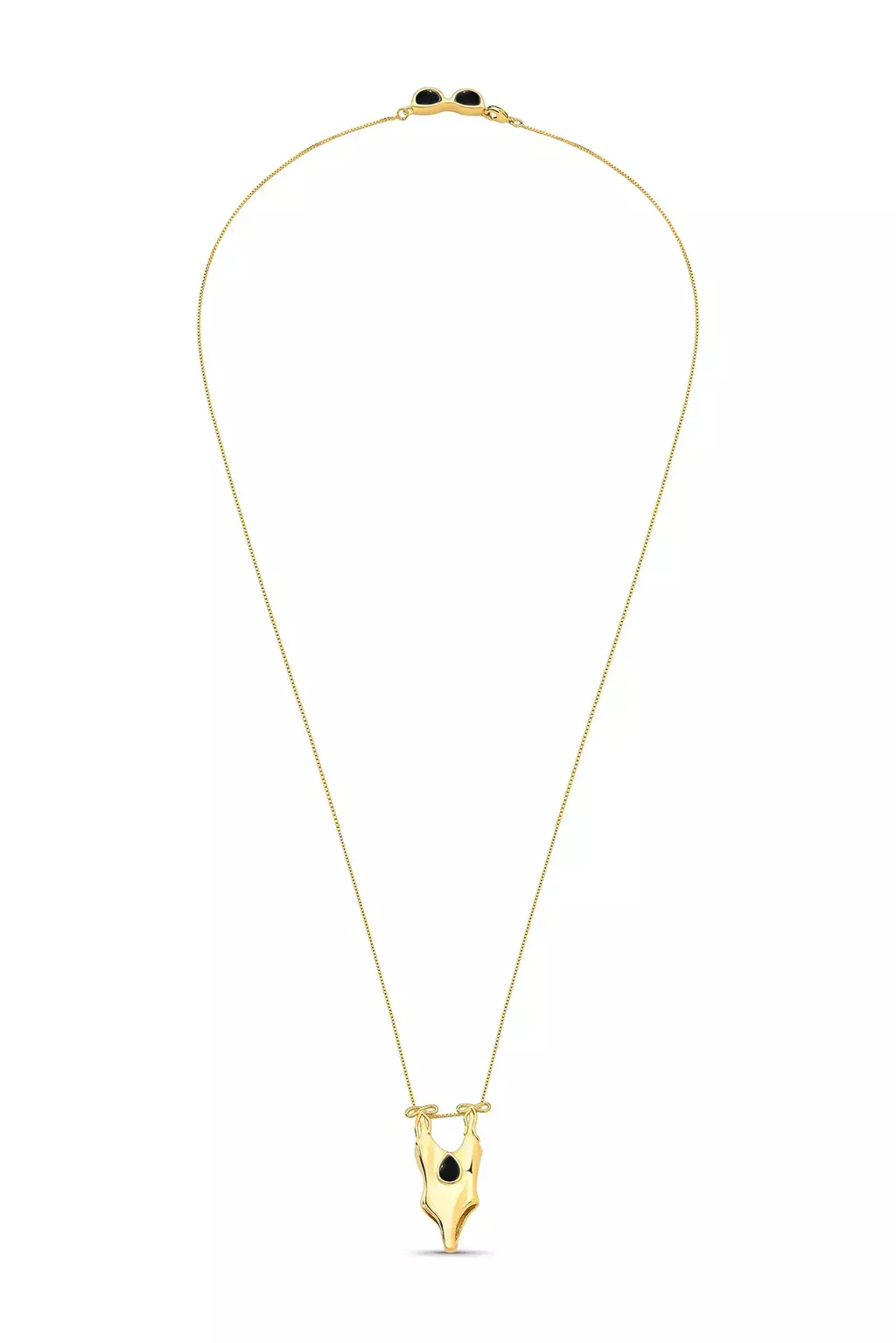 O Colar Verão Maria Dolores é a tradução da alegria e da sofisticação em uma única peça. Um escapulário folheado a Ouro em malha Veneziana que combina leveza, arte e diversão. De um lado, o pingente em formato de óculos traz duas pedras naturais Obsidiana Preta, e do outro, o mini maiô ganha corpo realista e detalhe em pedra Obsidiana, com a malha veneziana passando por dentro da alça, criando uma pequena escultura de vestir. Uma peça que transforma elementos do verão em joia, unindo frescor, cor e personalidade, sem perder a elegância que define a coleção Dolce Tropicália, perfeita para quem quer sofisticação com leveza em cada detalhe.